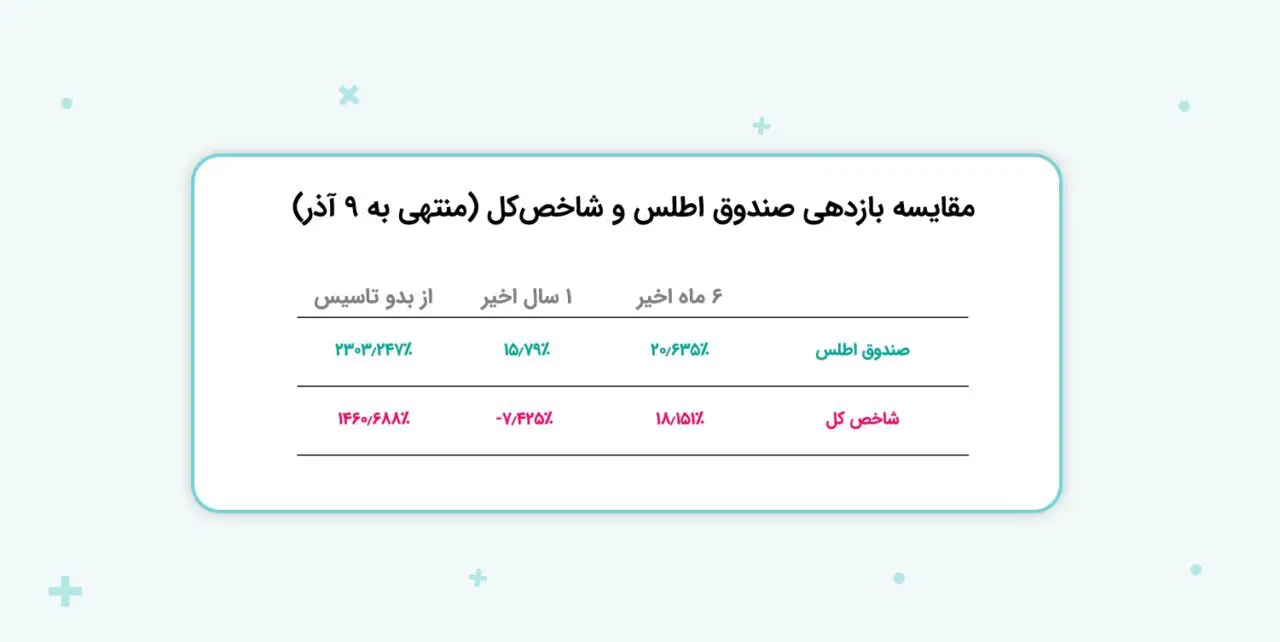 صندوق اطلس در دی‌ماه ۹۲ با ارزش هر واحد ۱۰۰۰ تومان راه اندازی شد. در اواسط شهریور سال ۱۴۰۲ قیمت هر واحد صندوق‌ اطلس بیش از ۴۱ هزار و ۲۰۰ تومان بوده است. یعنی ارزش سرمایه‌گذاری‌های این صندوق در طول ۱۰ سال بیش از ۴۱ برابر شده است. این در حالی است که در همین بازه زمانی شاخص بورس تقریبا ۲۴ برابر شده است.