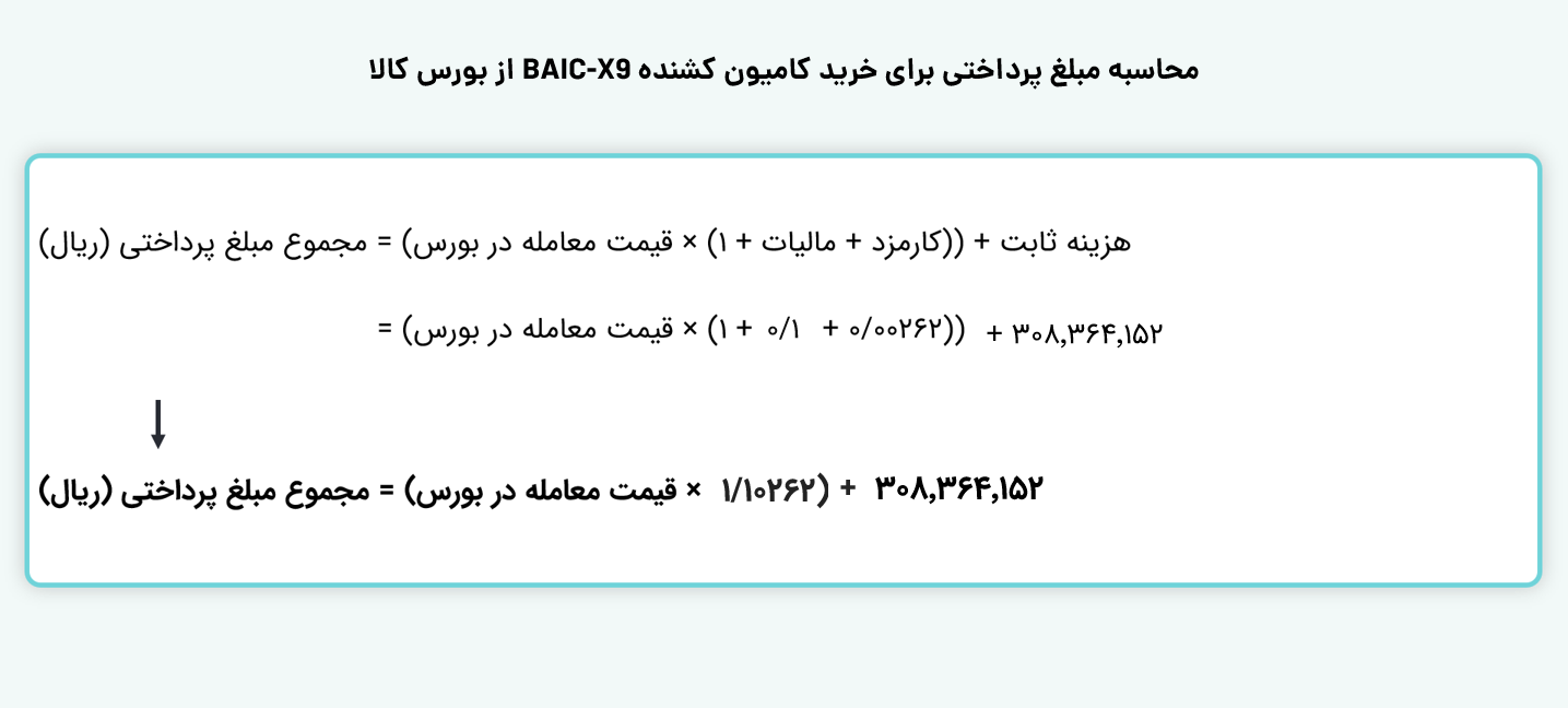 برای محاسبه مجموع مبلغ پرداختی برای خرید کامیون کشنده (BAIC-X9) از بورس کالا باید موارد زیر را در نظر بگیریم: