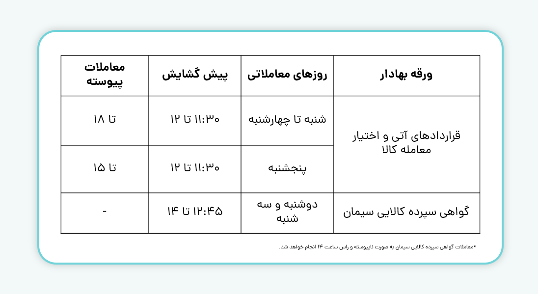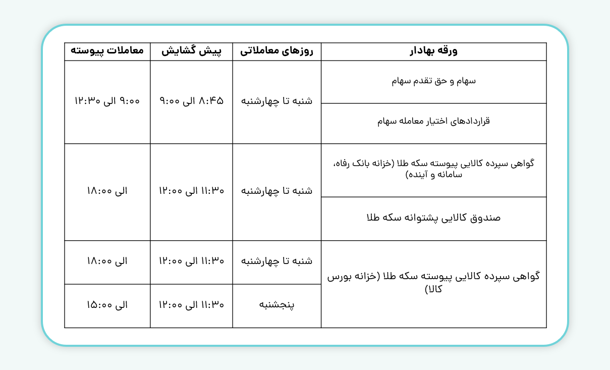 در این بخش از مقاله آموزش بورس میتوانید ساعت معاملات مهمترین اوراق بهادار قابل معامله در بازار را به طور خلاصه در جدول زیر مشاهده کنید: (آبان ۱۴۰۲)