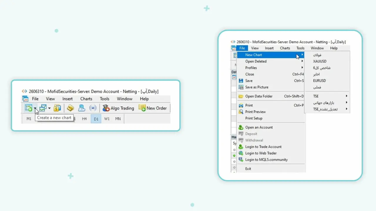 از طریق دستور نمودار جدید (New Chart) منوی فایل یا از طریق دکمه  Create a new chart موجود در نوار ابزار استاندارد، می‌توانید از بین نمادهای جاری یک مورد را انتخاب کنید.