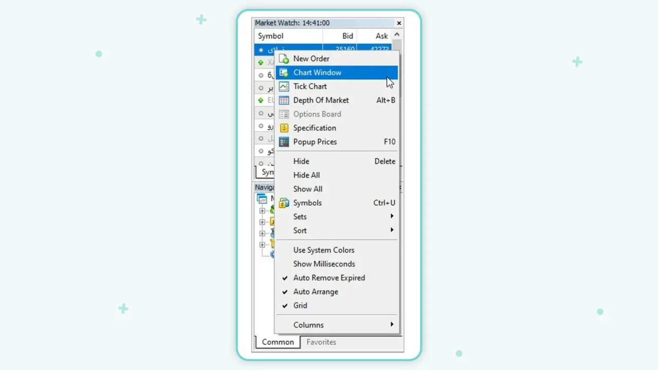 از طریق پنجره دیده‌بان بازار (Market Watch) نیز می‌توانید نمودارهای جدید را باز کنید. برای این کار کافی است روی نام نماد کلیک کرده و هم‌زمان، آن را به محیط رسم چارت بکشید و کلیک ماوس را رها کنید. همچنین می‌توانید روی نماد مورد نظر راست کلیک کرده و گزینه Chart Window را انتخاب کنید.