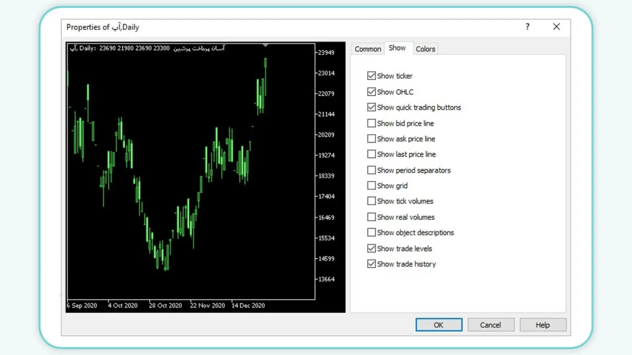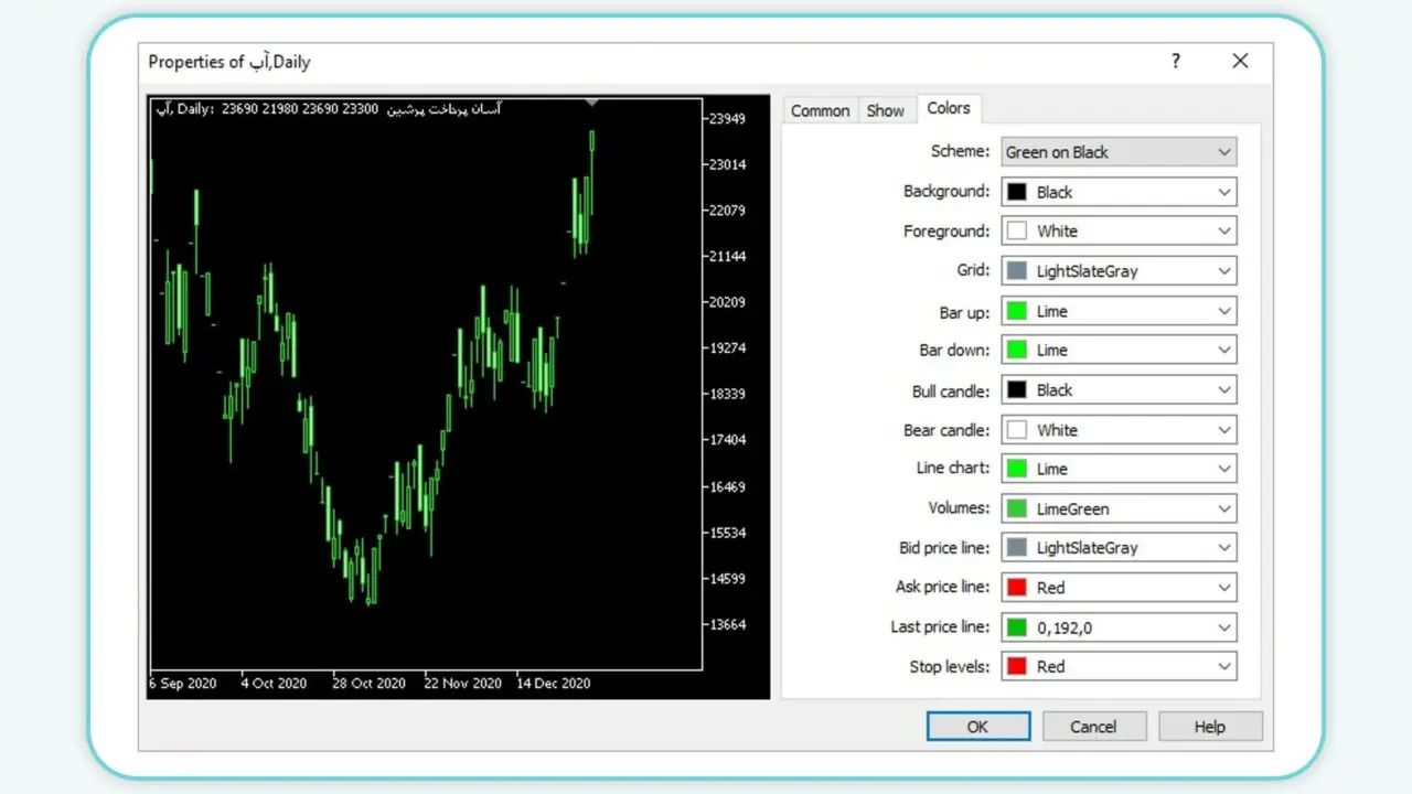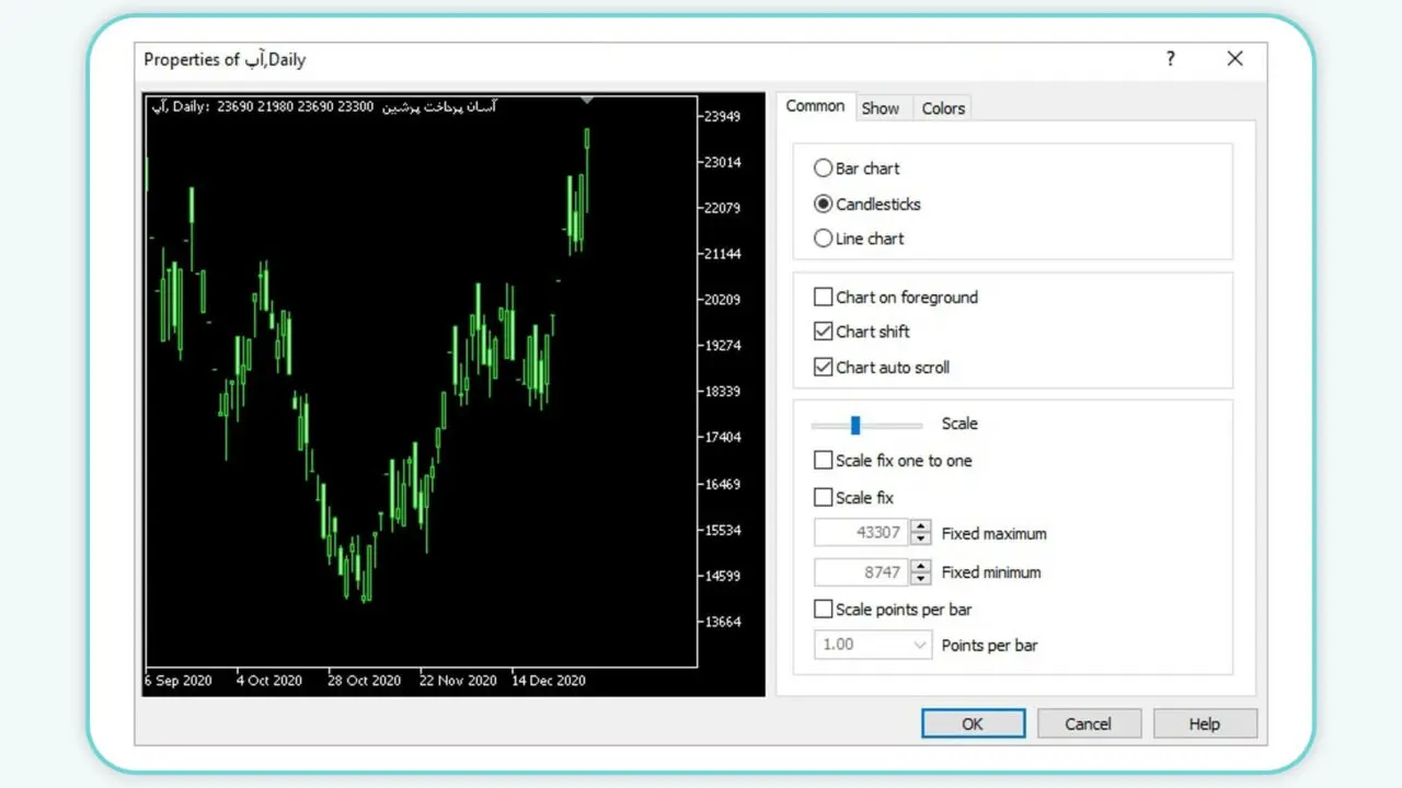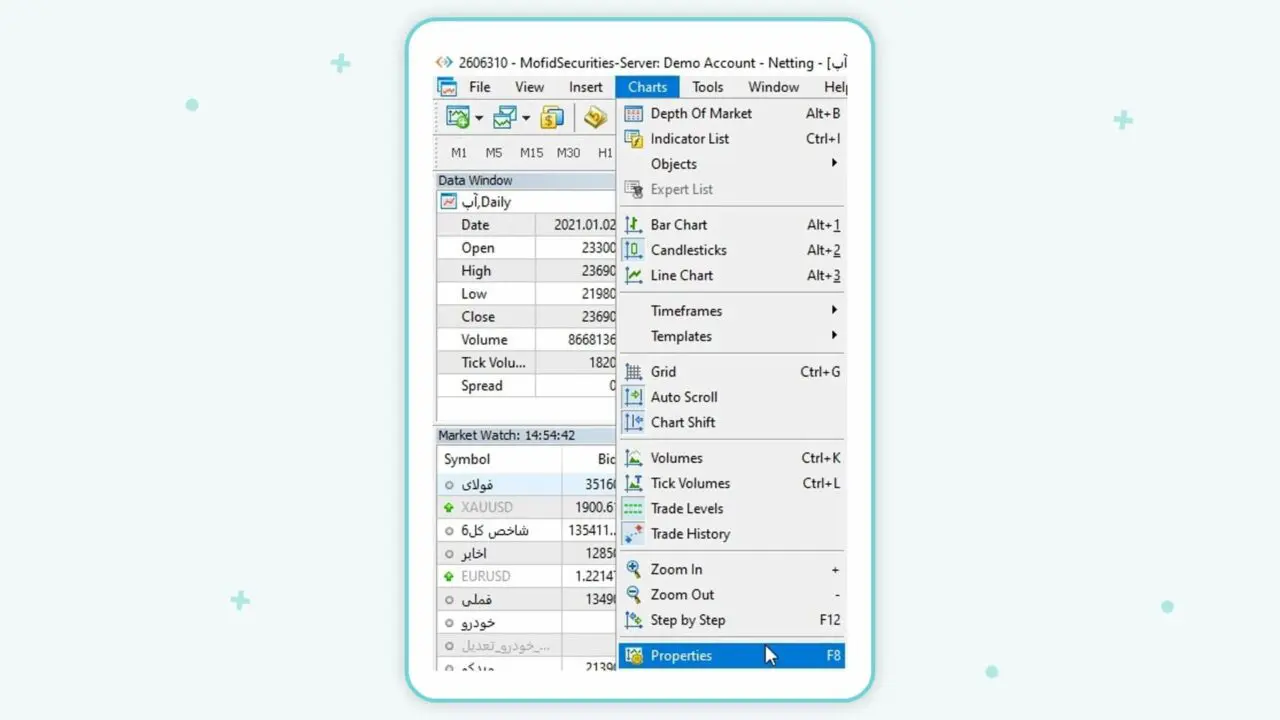 ظاهر نمودار و ویژگی‌های آن را می‌توانید به طور جداگانه تنظیم کنید. برای این کار کافی است از منوی Charts، گزینه‌ی Properties را انتخاب کنید یا کلید F8 را فشار دهید.