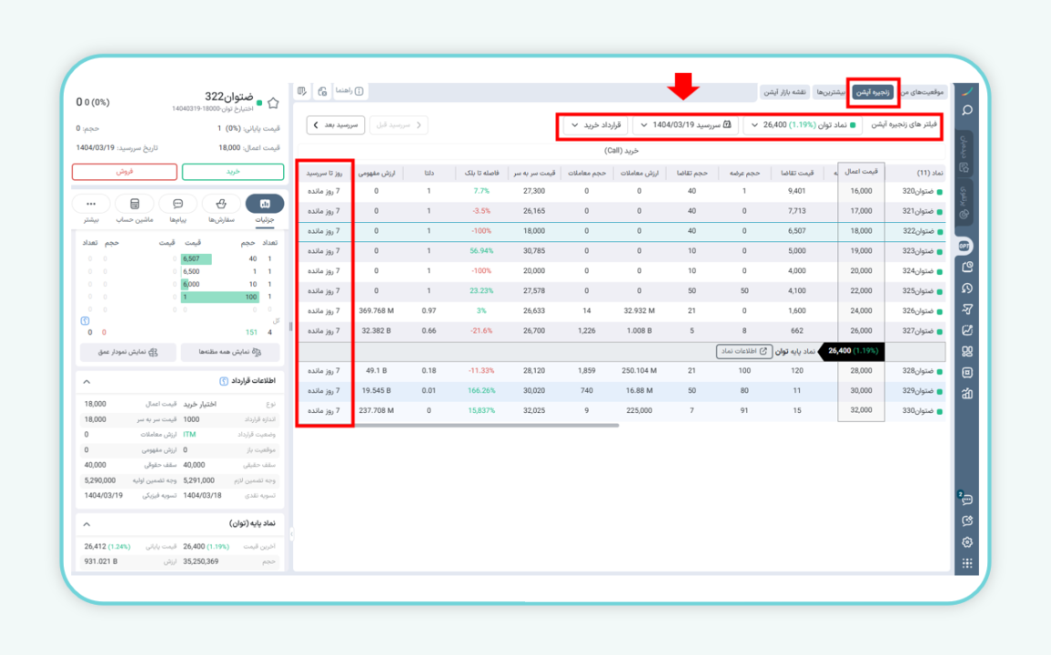 در سامانه ایزیتریدر، با ورود به بخش معاملات آپشن و انتخاب گزینه «زنجیره آپشن»، میتوان با کلیک بر روی هر قرارداد، تعداد روزهای باقیمانده تا سررسید را در ستون «روز تا سررسید» مشاهده کرد. همچنین با استفاده از گزینه «فیلتر های زنجیره آپشن» میتوان قراردادها را بر اساس تاریخ سررسید فیلتر و دستهبندی کرد.