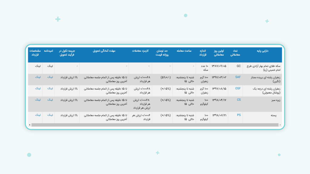 لیستی از داراییهای پایه قرارداد آتی در سایت بورس کالای ایران قرار دارد. در حال حاضر قراردادهای آتی زعفران رشتهای بریده ممتاز (نگین)، زعفران رشتهای درجه یک (پوشال معمولی)، زیره سبز و پسته به ترتیب با نمادهای CS، OSF، SAF و PS وجود دارند که میتوان امیدنامه یا مشخصات قرارداد هر یک از آنها را در این سایت مشاهده نمایید. همچنین به تازگی قرارداد آتی نقره ، قرارداد آتی صندوق طلا و قرارداد آتی شمش طلا نیز به بازار قراردادهای آتی کالایی اضافه شده است.