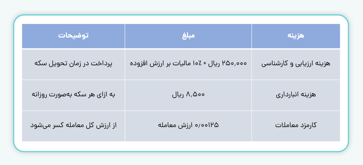 ۱- هزینه ارزیابی و کارشناسی هر سکه: ۱۴۲,۰۰۰ ریال (در زمان تحویل دریافت می‌شود) به همراه ۱۰ درصد مالیات بر ارزش افزوده.