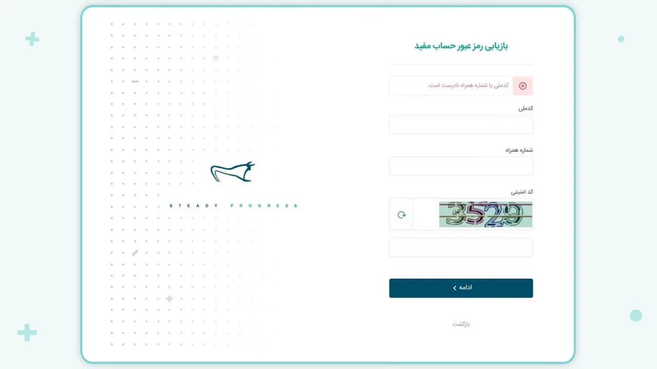 در صورتی که در گام دوم، شماره همراه یا کد ملی خود را به درستی وارد نکنید یا اگر شماره همراه وارد شده با آنچه قبلا به کارگزاری مفید ارائه کردهاید یکسان نباشد، مطابق تصویر زیر با خطای «کد ملی یا شماره همراه نادرست است» روبرو خواهید شد.
