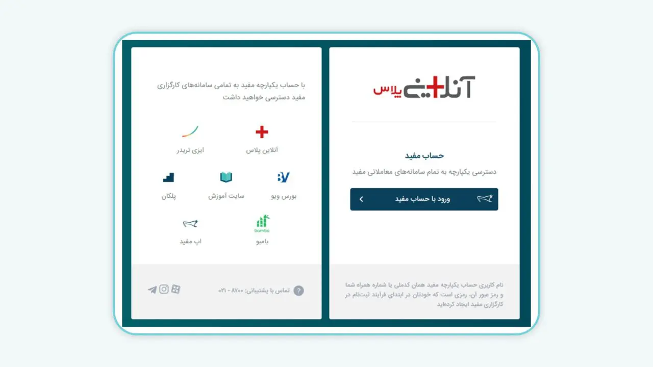 در حال حاضر، جهت ورود به سامانه «آنلاینپلاس» با استفاده از گزینه «ورود با حساب یکپارچه مفید»، میتوانید از کد ملی یا شماره همراه به عنوان نام کاربری استفاده نمایید. همچنین رمز عبور، همان رمز عبوری است که در ابتدای فرآیند ثبتنام در کارگزاری مفید تعیین کردهاید. در صورت فراموشی رمز یا تمایل به ایجاد رمز جدید، میبایست گزینه «رمز عبور خود را فراموش کردهام» را انتخاب کرده و اقدام به ایجاد رمز عبور جدید نمایید.