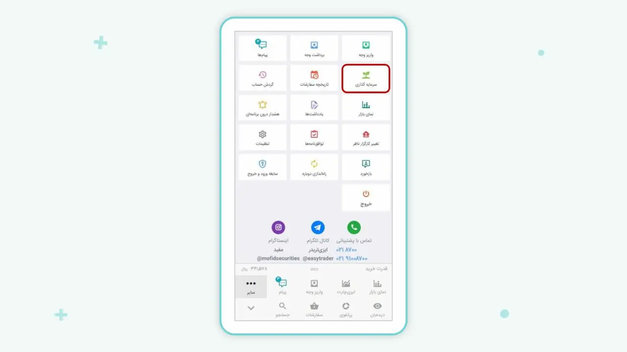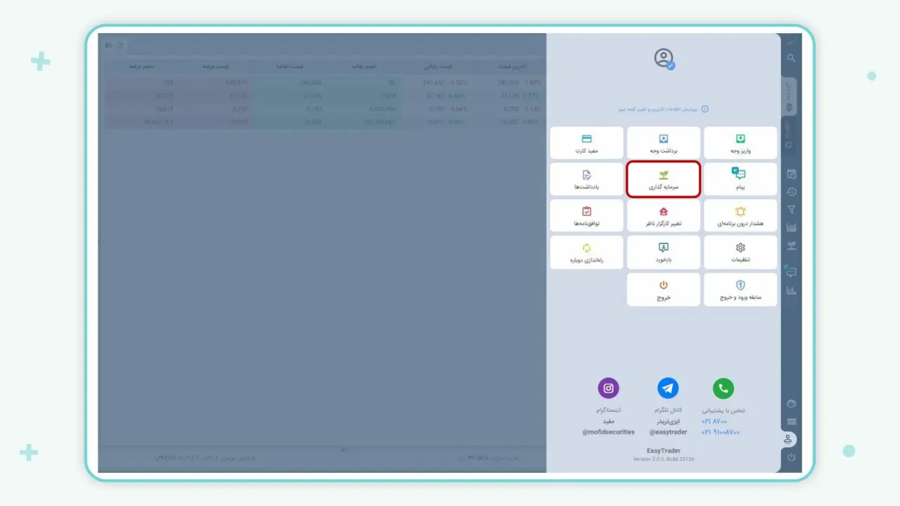 پس از ورود به سامانه معاملاتی ایزی تریدر، بر روی گزینه «سایر» کرده و به قسمت «سرمایه‌گذاری» مراجعه کنید.