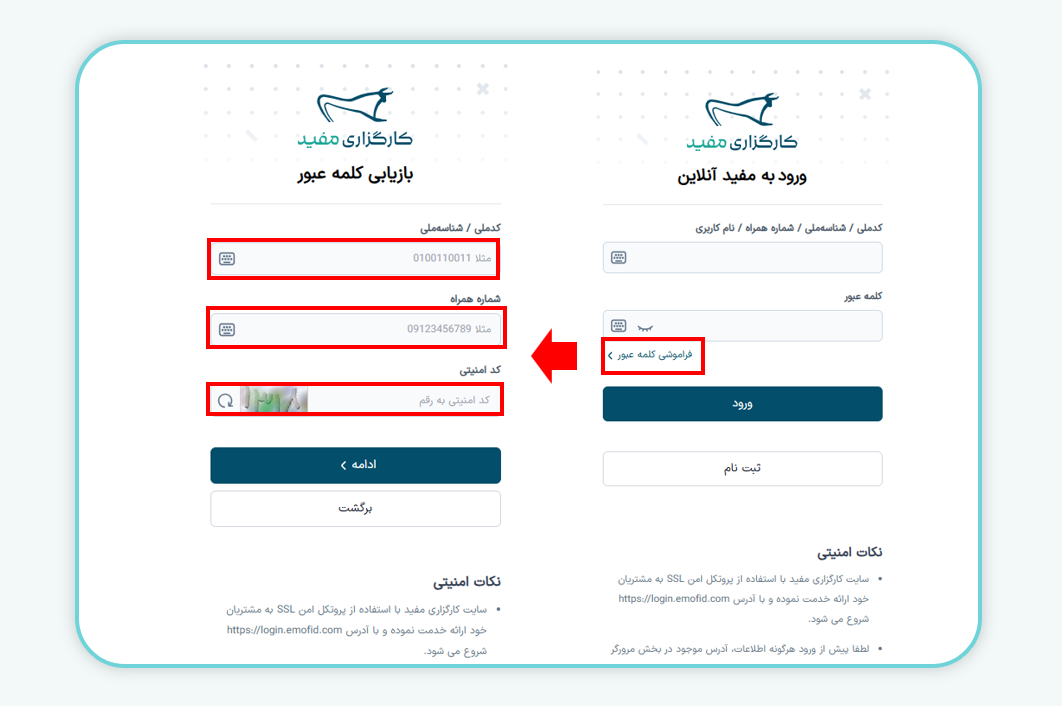 لازم به ذکر است مطابق با تصویر زیر در صورت فراموش کردن رمز عبور می‌توانید با کلیک بر روی گزینه «رمز عبور خود را فراموش کرده‌ام»  رمز خود را بازیابی کنید. پس از کلیک بر روی این گزینه، با وارد کردن کد ملی، شماره همراه و کد امنیتی، امکان بازیابی رمز عبور برای شما فراهم می‌شود.