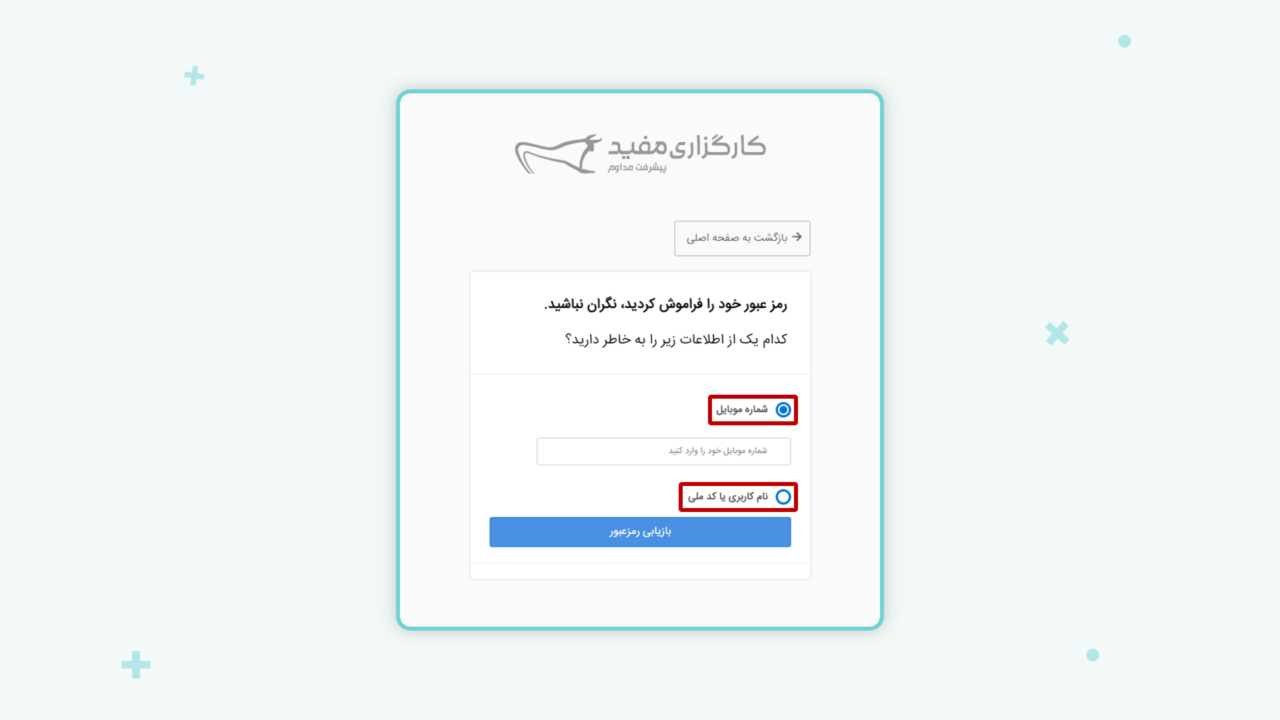 لازم به ذکر است مطابق با تصویر زیر در صورت فراموش کردن رمز عبور میتوانید با کلیک بر روی گزینه «رمز عبور خود را فراموش کردهام» رمز خود را بازیابی کنید. پس از کلیک بر روی این گزینه، با وارد کردن کد ملی، شماره همراه و کد امنیتی، امکان بازیابی رمز عبور برای شما فراهم میشود.