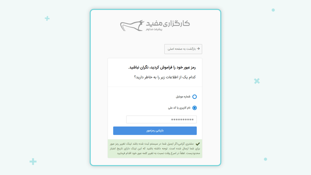 در صورتی که در سامانه «آنلاینپلاس» اقدام به تغییر نام کاربری خود کرده باشد، امکان استفاده از کد ملی یا شماره همراه خود را به عنوان نام کاربری نخواهید داشت و در صورت استفاده از آنها به عنوان نام کاربری، با خطا مواجه خواهید شد. لذا میبایست ابتدا نام کاربری صحیح را وارد کرده و اقدام به بازیابی رمز عبور نمایید تا پس از آن برای هر ورود جدید نیازی به بازیابی رمز ورود نباشد. در نظر داشته باشید، جهت مشاهده نام کاربری خود میتوانید از طریق سامانه پنل مشتریان اقدام نمایید.