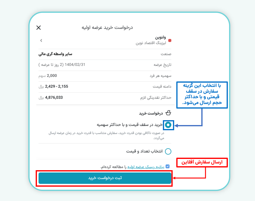 مرحله دوم ثبت سفارش آفلاین – انتخاب سقف قیمت و حداکثر سهمیه