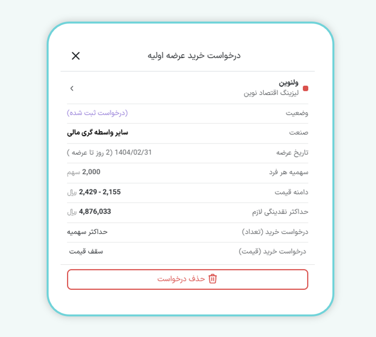 مطابق با اطلاعیه بورس تهران، روز چهارشنبه ۳۱ اردیبهشت ۱۴۰۴، مجموعا ۴۹۰,۰۰۰,۰۰۰ سهم معادل ۷ درصد از شرکت لیزینگ اقتصاد نوین با نماد «ولنوین» عرضه می‌شود. برای ثبت سفارش آفلاین نیاز است تا ابتدا وارد سامانه ایزی تریدر شوید و در قسمت دیده‌بان، گزینه «عرضه اولیه» را انتخاب کنید.