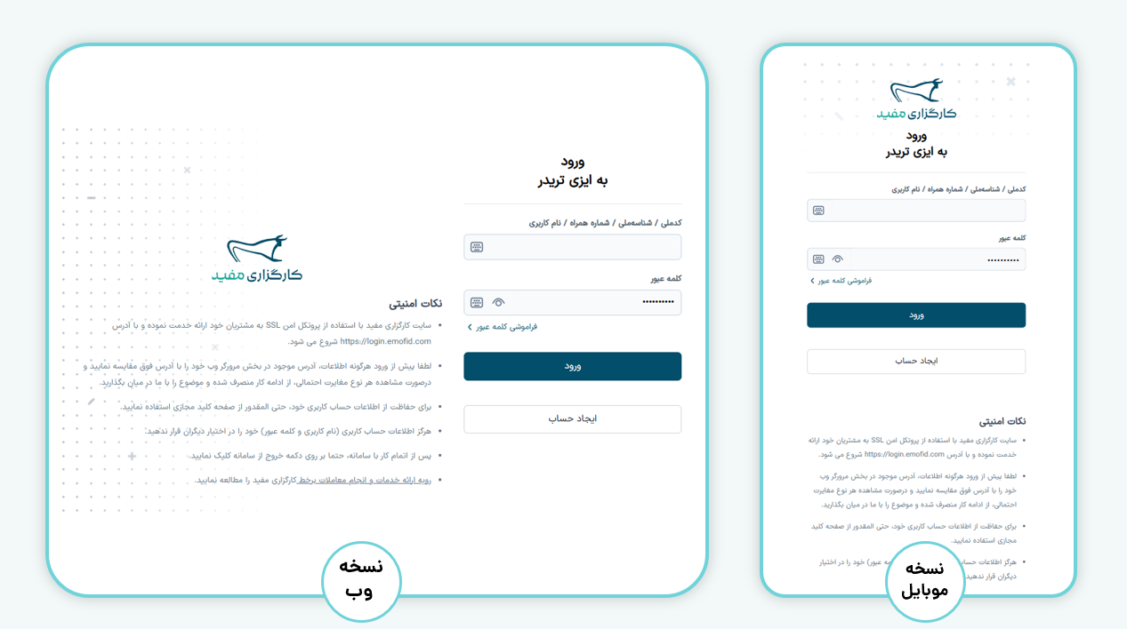 برای ورود به ایزی تریدر ابتدا در مرورگر موبایل یا رایانه خود به آدرس easytrader.ir مراجعه یا عبارت «ایزی تریدر» را در گوگل جستجو کنید. سپس مطابق با تصویر زیر با استفاده از کد ملی یا شماره همراه خود و رمز عبوری که در زمان افتتاح حساب در کارگزاری مفید ایجاد کردهاید وارد ایزی تریدر شوید.