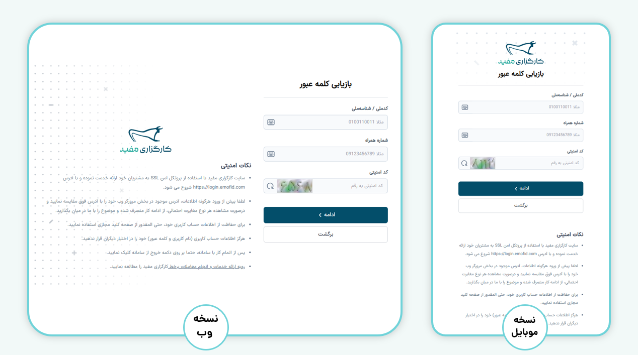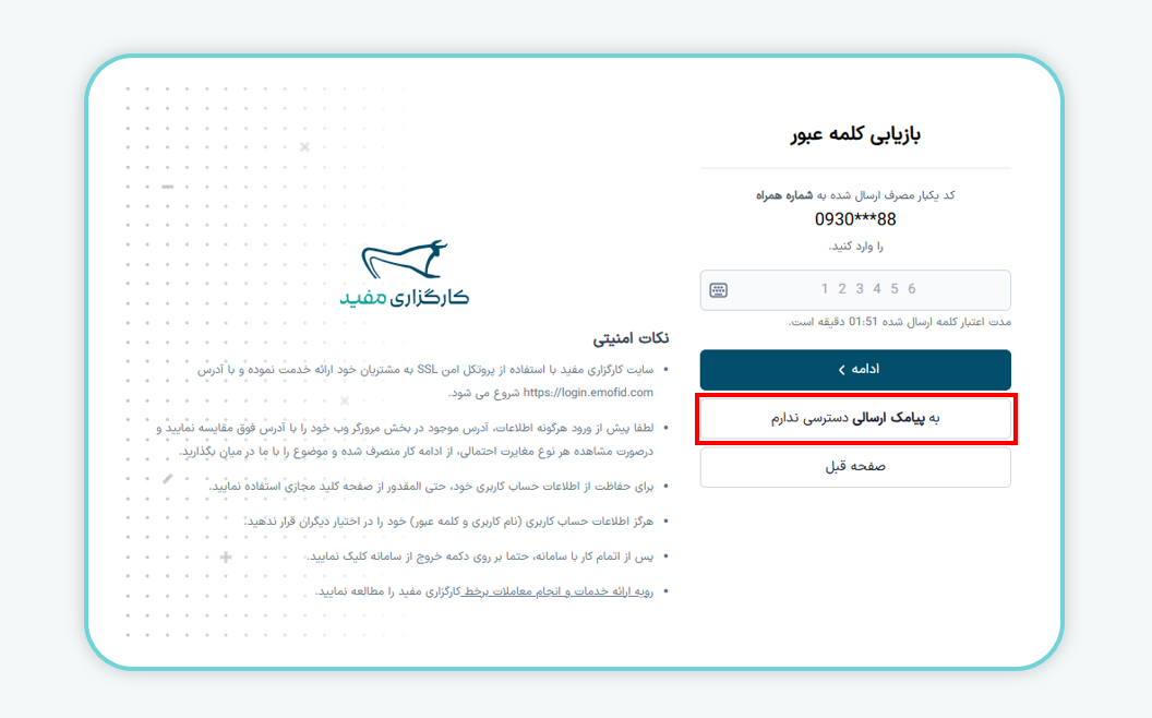 در صورتی که به شماره همراه ثبتشده در سامانههای آنلاین دسترسی ندارید، پس از وارد کردن کد ملی/شناسه ملی، شماره همراه و کد امنیتی، میتوانید بر روی گزینه «به پیامک دسترسی ندارم» کلیک کنید. سپس با انتخاب گزینه ارسال از طریق ایمیل، کد یکبار مصرف به آدرس ایمیل ثبتشده هنگام ثبتنام ارسال میشود و در ادامه میتوانید به صفحه ایجاد رمز عبور جدید دسترسی داشته باشید.