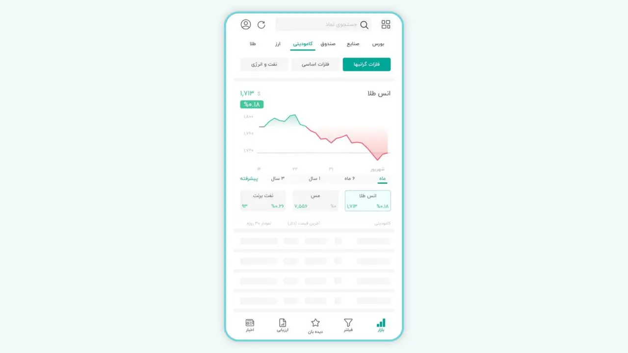 بخش کامودیتی در سامانه بورسویو موبایل دارای ۳ قسمت فلزات گرانبها، فلزات اساسی، نفت و انرژی است که شما میتوانید میزان و درصد تغییرات آنها را در بازههای زمانی مختلف بررسی کنید. هر یک از این قسمتها برای تحلیل بازار در بخش کامودیتیها بسیار حائز اهمیت است. با کلیک بر روی هر کامودیتی جزئیات بیشتر همچون نمودار قیمت و تاریخچه معاملات به نمایش در میآیند.
