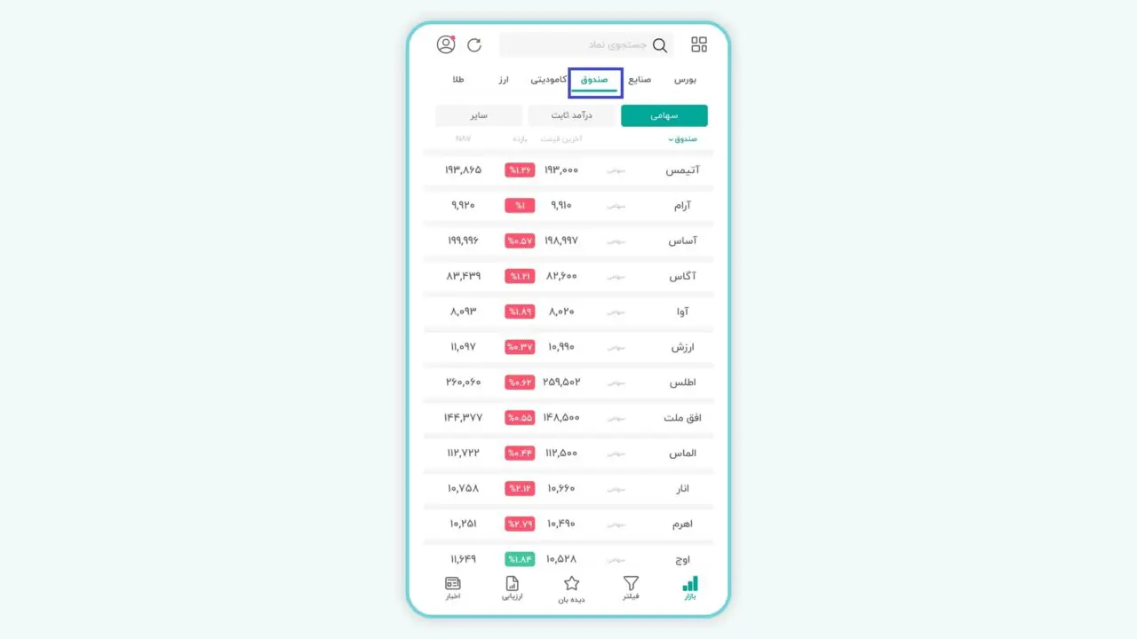 در این قسمت شما میتوانید تمامی صندوقها و میزان بازدهی آنها را مشاهده کنید. همچنین در این قسمت، صندوقها به سه دسته درآمد ثابت، سهامی و سایر تقسیم شدهاند تا بتوانید از این اطلاعات بهصورت سریع و راحت برای تحلیل بازار استفاده کنید.