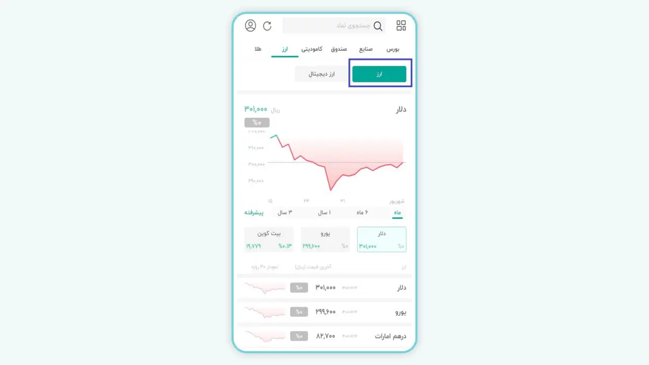 - مشاهده اطلاعات ارزهای فیات مثل دلار، شامل نمودار، قیمت لحظهای و درصد تغییرات