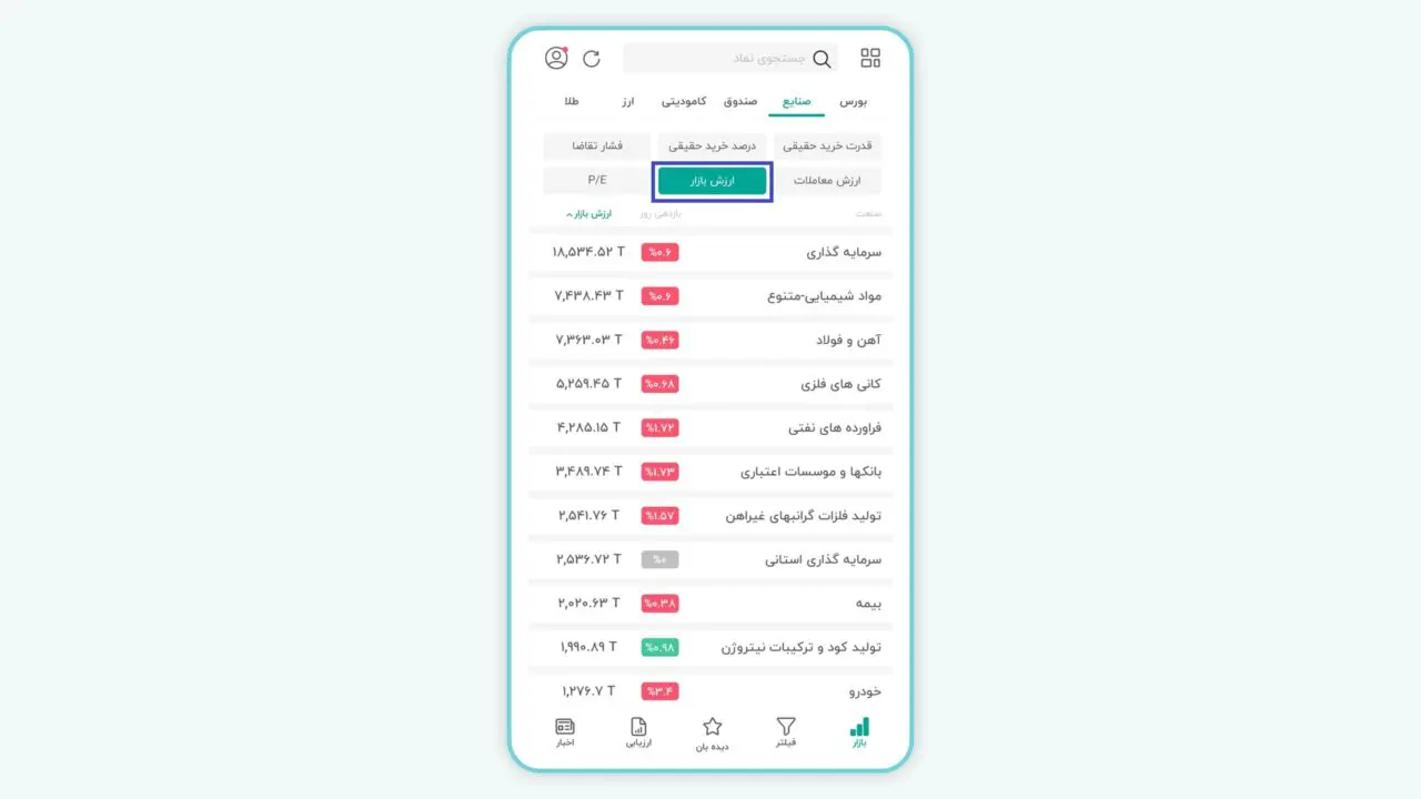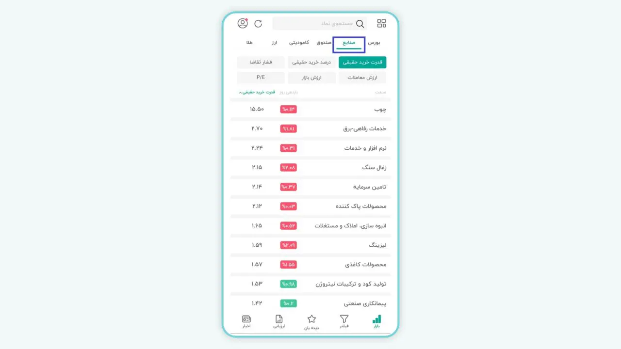 پنجره «صنایع» در سامانه بورس ویو موبایل