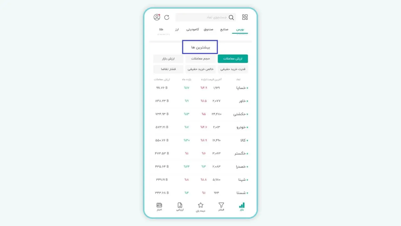 - مشاهده نمادهایی با بیشترین ارزش معاملات