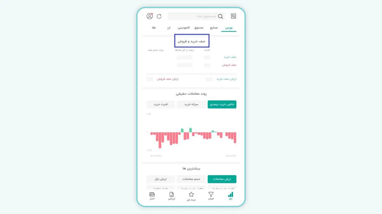 صف خرید و فروش قسمت دیگری است که در زیر مجموعه بورس قرار دارد و میتواند در یک نگاه اطلاعات مفیدی را به تحلیلگران بازار سرمایه ارائه کند. در این قسمت مجموع ارزش هر یک از صفهای خرید و فروش نمایش داده میشود. همچنین تعداد و درصد نمادهای موجود در صفهای خرید و فروش نیز به تفکیک درج شده است.