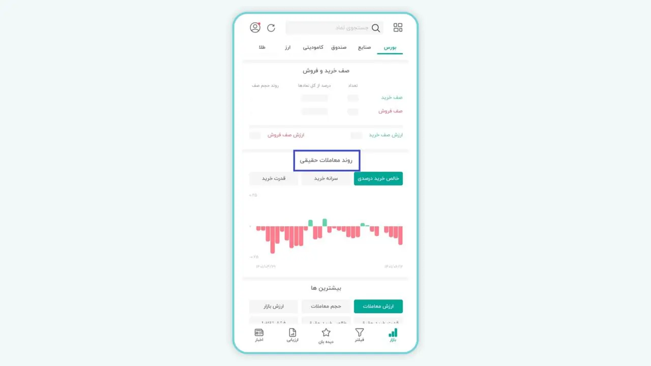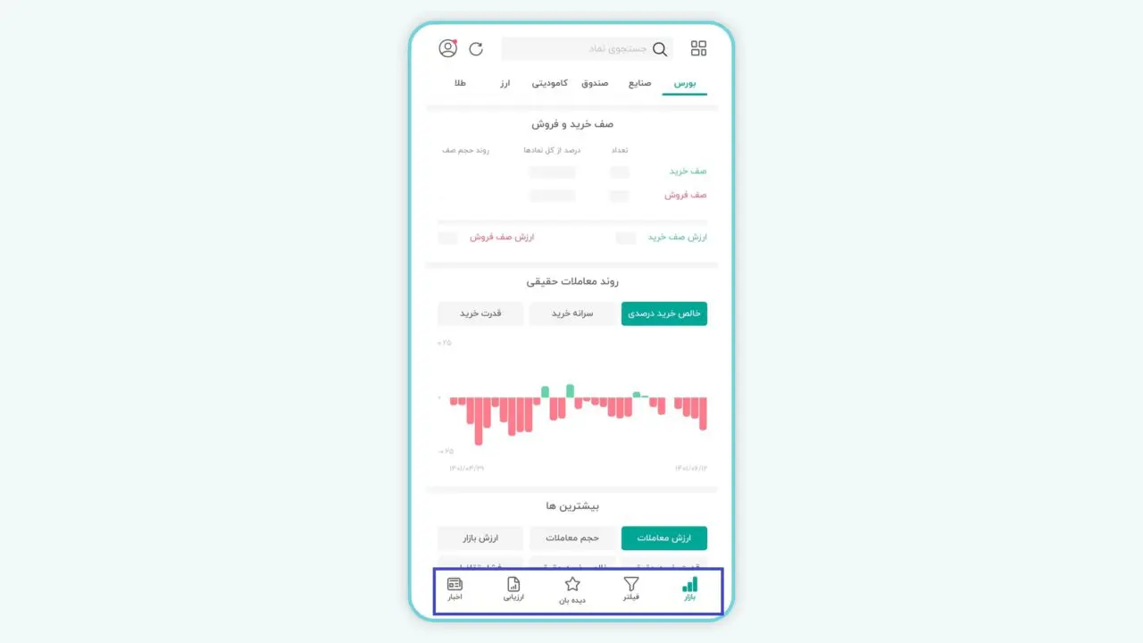 قسمت «بازار» یکی از مهمترین بخشهای سامانه بورسویو موبایل است که اطلاعات بهروز و لحظهای از وضعیت بازار را در اختیار شما قرار میدهد. این بخش به پنجرههای بورس، صنایع، صندوق، ارز و طلا، کامودیتی و محصولات تقسیم میشود که در ادامه هر یک از آنها را بررسی میکنیم: