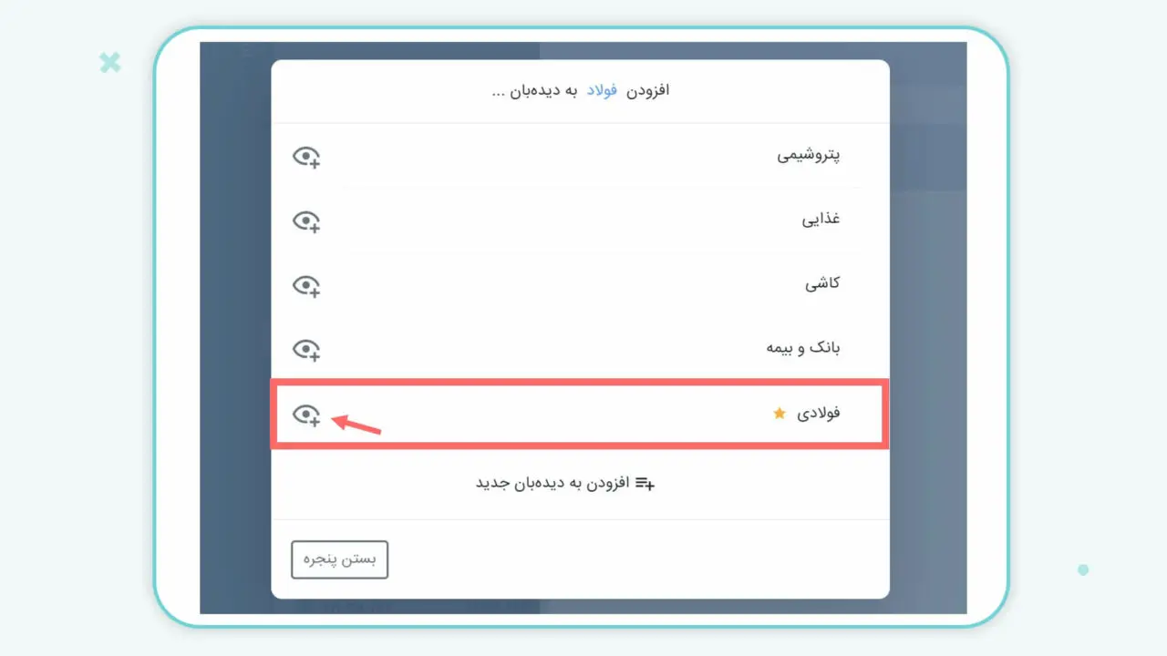 برای مثال، شما می‌توانید در یک دیده‌بان نمادهای مورد نظر خود را در صنعت فولاد اضافه کنید و نام آ‌ن را «فولادی» قرار دهید. در صورتی‌که می‌خواهید این دیده‌بان به عنوان دیده‌بان پیش‌فرض شما قرار داده شود، با فعال کردن گزینه «دیده‌بان پیش‌فرض» و سپس ثبت کردن آن می‌توانید دیده‌بان مورد نظر خود را پیش‌فرض قرار دهید.