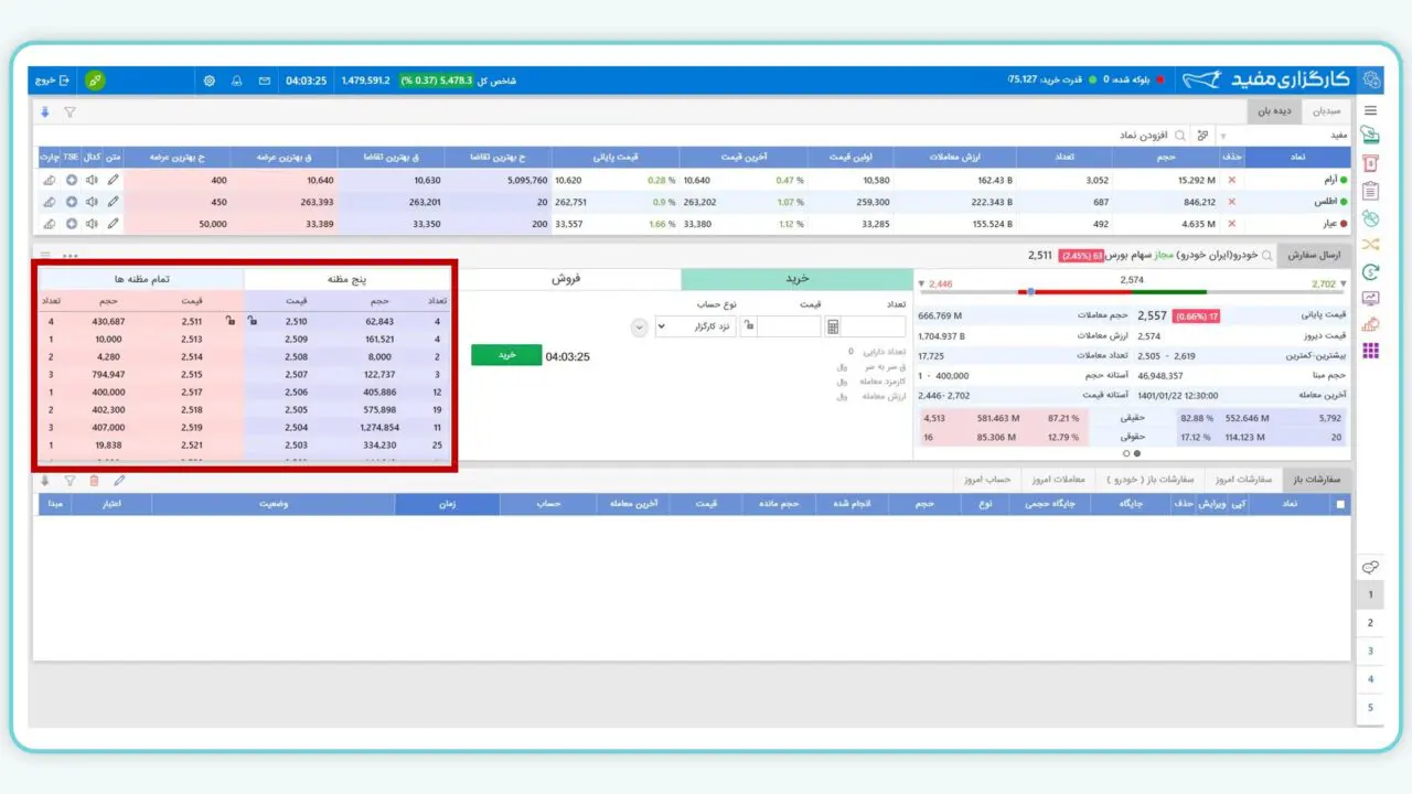 - اطلاعات عمق بازار، معاملهگران را قادر میسازد تا یک نمای کلی از تمام سفارشات مرتبط با یک نماد را مشاهده کنند. به کمک این قابلیت میتوان جهت احتمالی حرکت قیمت یک اوراق بهادار خاص را تعیین کرد. همچنین این ویژگی به معاملهگران کمک میکند تا از نوسانات کوتاهمدت قیمت، به نفع خود استفاده کرده و سود ببرند. به عنوان مثال، اگر شخصی بخواهد در یک نماد، سهام زیادی خریداری کند، دادههای عمق بازار به وی اجازه میدهد تا میانگین قیمت خرید را تخمین بزند.