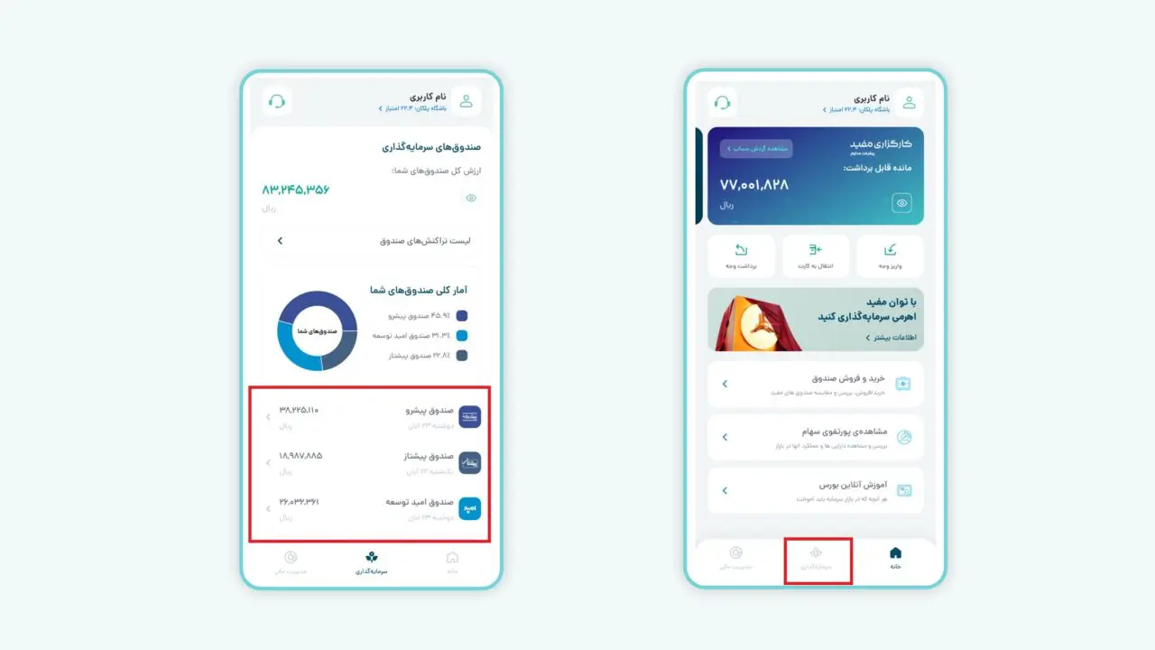 امکان بررسی دارایی از طریق مفید اپ و قسمت سرمایه گذاری در ایزی تریدر فراهم است.