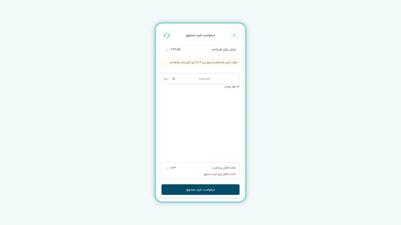 • در صورتی که مبلغ مورد نظر شما برای سرمایه‌گذاری در صندوق، بیش از قدرت خریدتان باشد، به صفحه افزایش موجودی منتقل می‌شوید.
