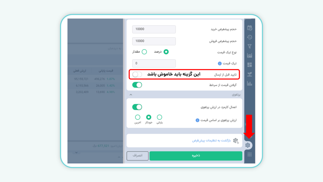 به صورت معمول پس از درج تعداد و قیمت سفارش و ارسال آن، پنجره سفارشگذاری بسته میشود و در صورت اقدام برای ثبت سفارش مجدد، اطلاعات درج شده در آن به حالت پیشفرض باز میگردد. اگر قصد دارید تا پس از ارسال سفارش، اطلاعات درج شده توسط شما در کادر سفارشگذاری باقی بماند، لازم است تا از بخش تنظیمات، گزینه «نگهداری اطلاعات سفارش پس از ارسال» را فعال کرده و تغییرات را ذخیره کنید.