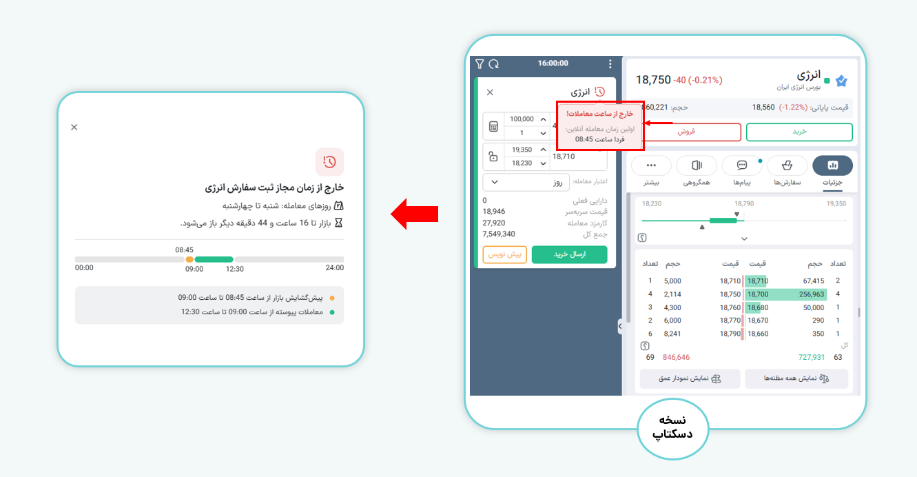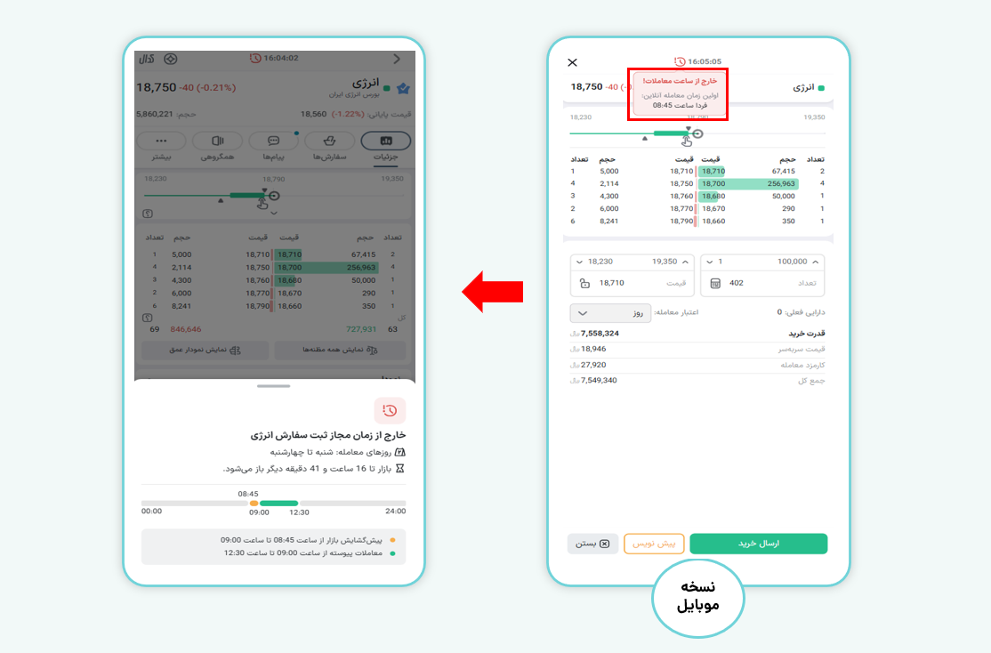 جهت اطلاع از زمان معاملات یک نماد، پیام ناظر نماد مورد نظر را مطالعه نمایید. جهت کسب اطلاعات بیشتر مقاله «ارسال سفارش در ایزیتریدر» را مطالعه نمایید.