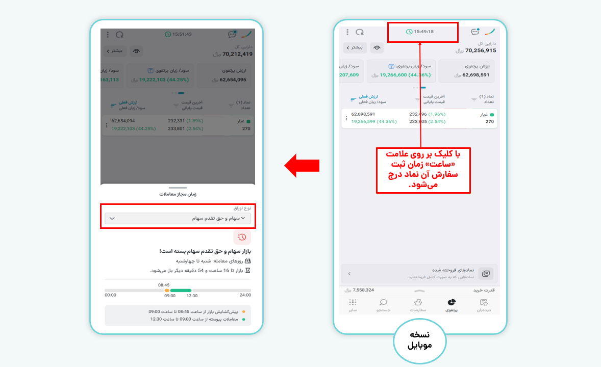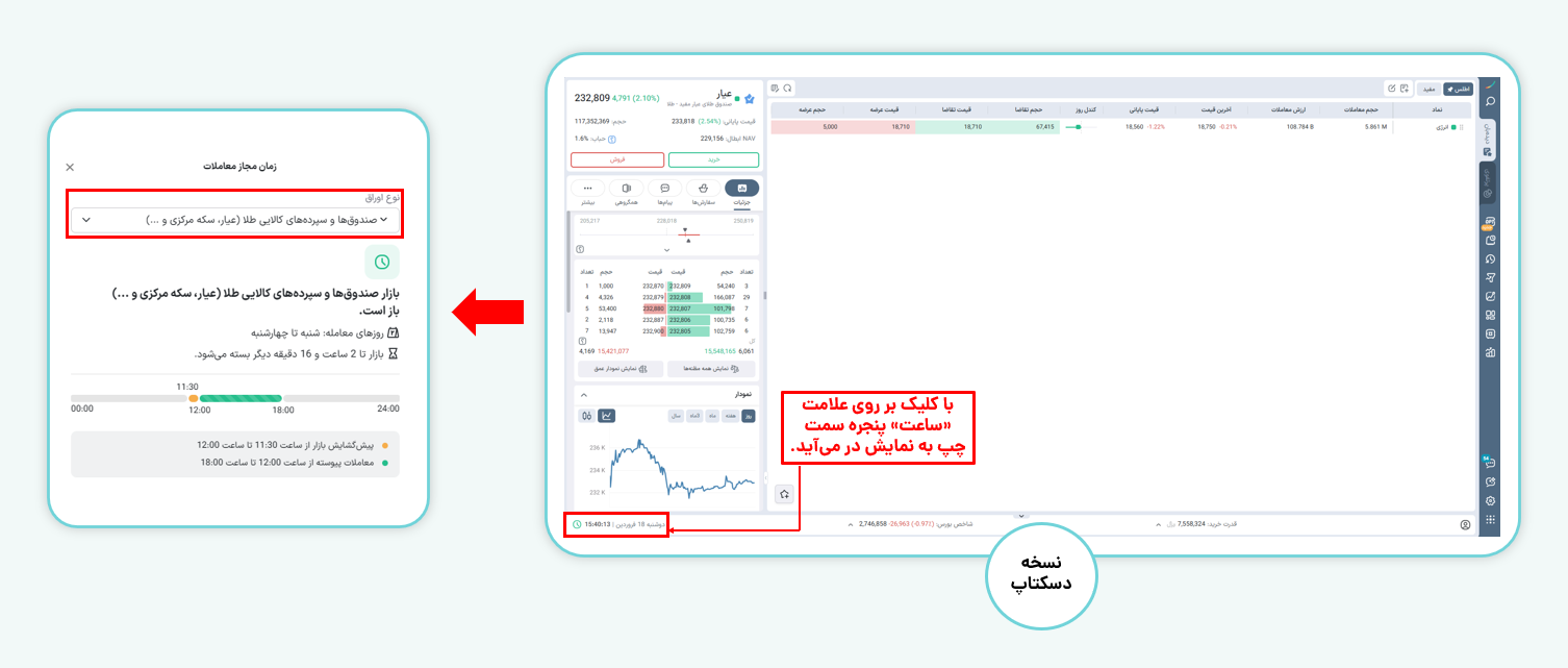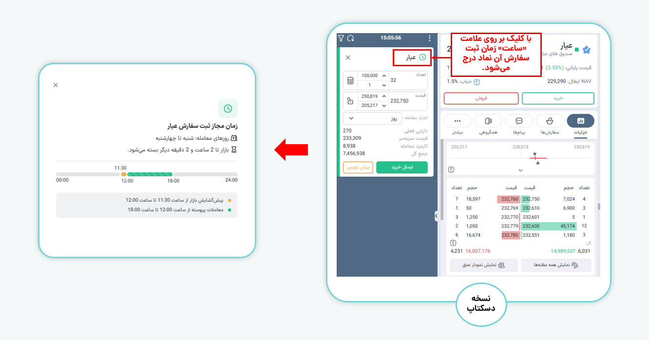 همچنین در صورتی که وارد پنجره سفارشگذاری برای یک سهم شوید، در کنار نام آن نماد علامت ساعتی قرار دارد که با انتخاب آن، این مرتبه صرفا ساعت ثبت سفارش برای همان نماد بهخصوص نشان داده میشود.
