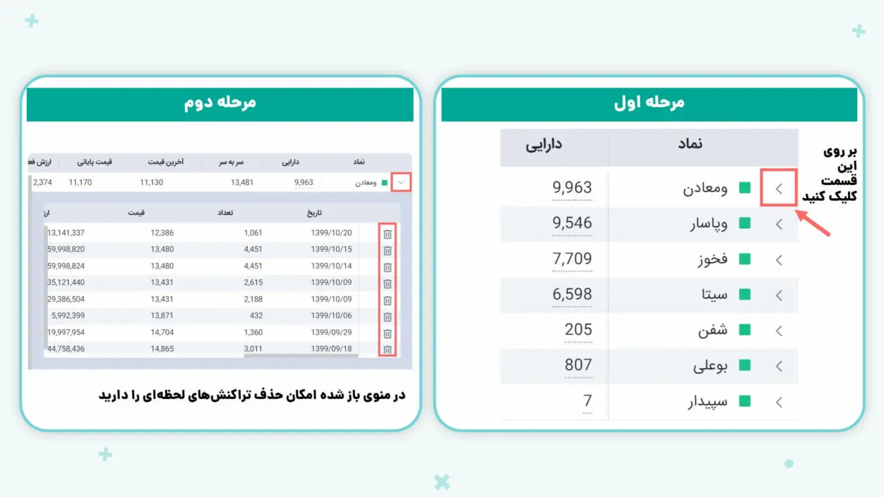 مطابق تصویر زیر، با کلیک بر روی علامت سمت چپ هر نماد در صفحه اصلی بخش پرتفوی، به صفحه «جزئيات نماد پرتفوی» منتقل خواهید شد.