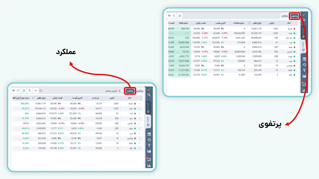 ارائه جزئیات کامل در رابطه با عملکرد، تراکنشها یا رویدادهای مربوط به هر نماد، از ویژگیهای مهم بخش «پرتفوی» در این سامانه محسوب میشود. همچنین بررسی نسبت نمادها در ترکیب دارایی، نمودار تغییرات ارزش سبد دارایی و … به شما کمک میکند تا با دید وسیعتری، سبد دارایی خود را مدیریت کنید.