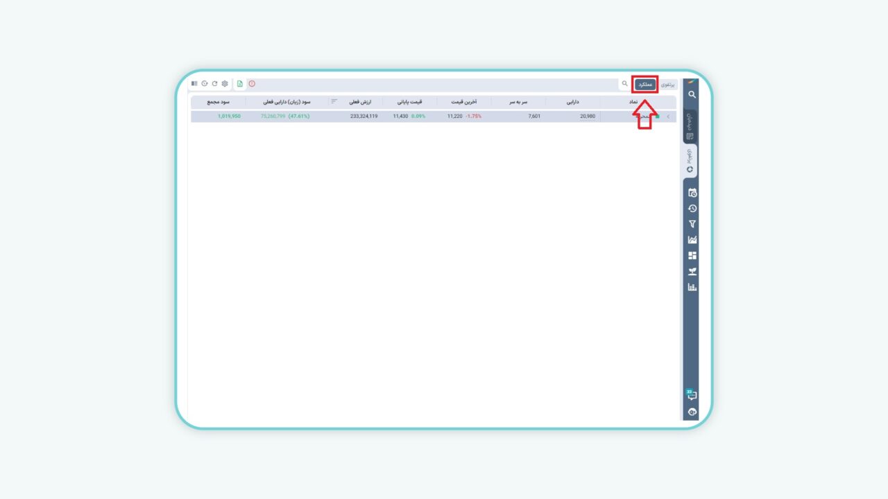 نکته: در صورتی که بیش از ۱۵ نماد در سبد دارایی وجود داشته باشد، امکان جستوجوی نماد از طریق علامت ذرهبین در گوشه سمت چپ بالای صفحه پرتفوی فراهم میشود. همچنین در این حالت، با رفتن به پایین فهرست نمادها، دکمهای برای بازگشت به بالای فهرست به نمایش در خواهد آمد.