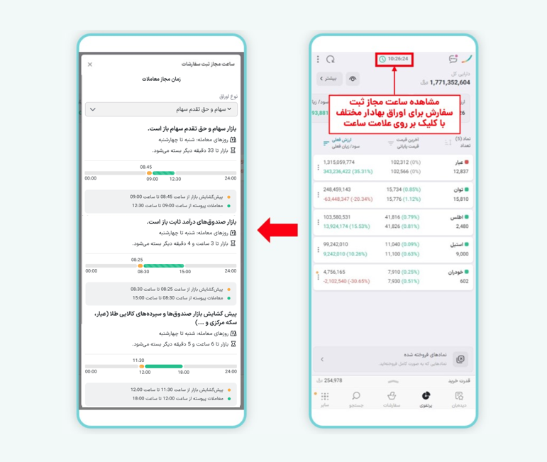 برای اطلاع از روزهای معاملاتی، بازه زمانی پیشگشایش و ساعت انجام معاملات اوراق بهادار مختلف، کافی است بر روی علامت ساعت در بالای صفحه کلیک کنید.