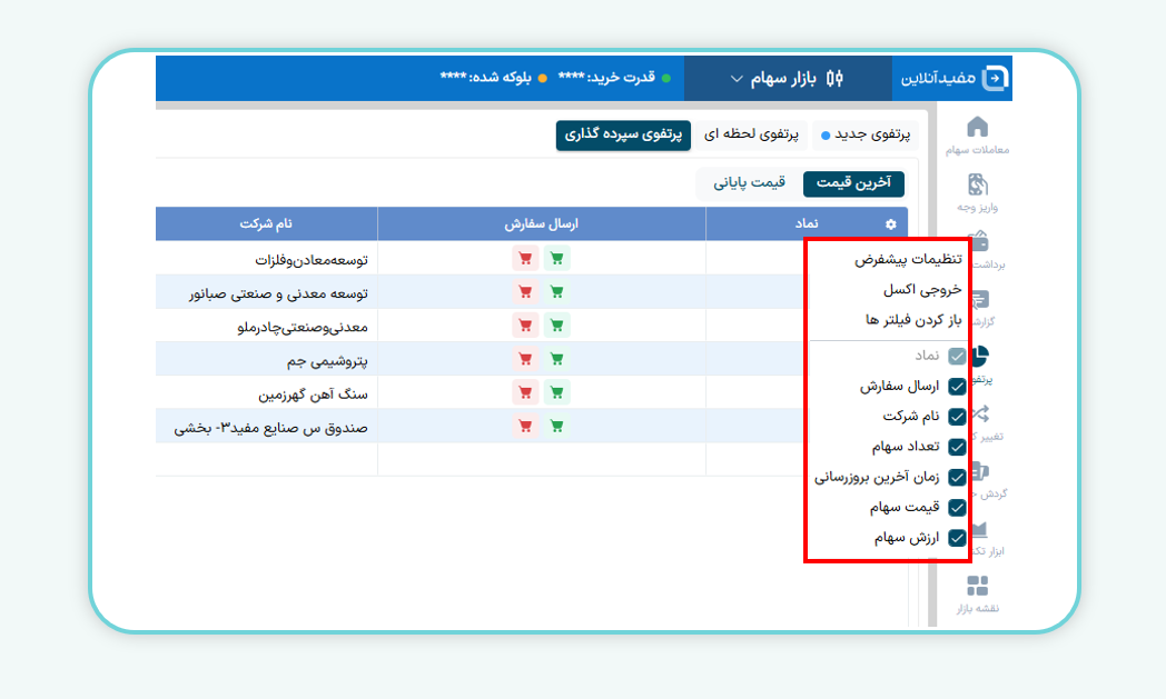 همچنین امکان شخصی‌سازی این ستون‌ها برای نمایش اطلاعات مورد نیاز کاربران در سبدبان وجود دارد. به این معنا که آنها می‌توانند بر اساس نیازهای خود، ستون‌های اضافی را حذف کرده یا ستون‌های جدیدی اضافه کنند. به‌عنوان مثال، کاربران می‌توانند ستون‌هایی مانند دارایی لحظه‌ای، دارایی سهام، آخرین قیمت، قیمت پایانی، قیمت سر به سر و … را به دلخواه خود مدیریت کنند. این قابلیت به آنها کمک می‌کند تا تجربه‌ی بهتری از استفاده از سبدبان داشته باشند و اطلاعات مرتبط با پرتفوی خود را به راحتی مشاهده کنند.