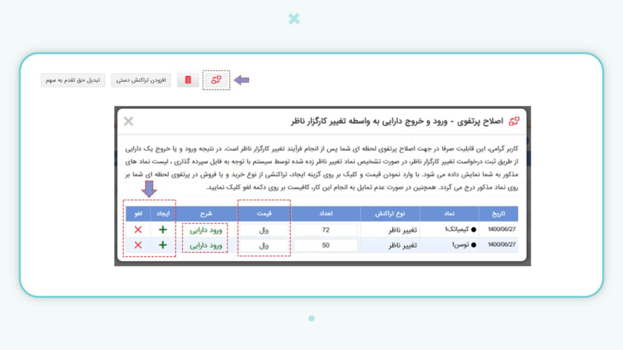 در این بخش امکان افزودن، حذف یا اصلاح دستی تراکنش‌ها، به‌ویژه برای مطابقت با اطلاعات پرتفوی جدید یا مدیریت رویدادهایی مانند افزایش سرمایه، نیز فراهم شده است. این قابلیت‌ها باعث می‌شود پرتفوی لحظه‌ای ابزاری دقیق و قابل تنظیم برای پایش دارایی و مدیریت بهینه سرمایه باشد.