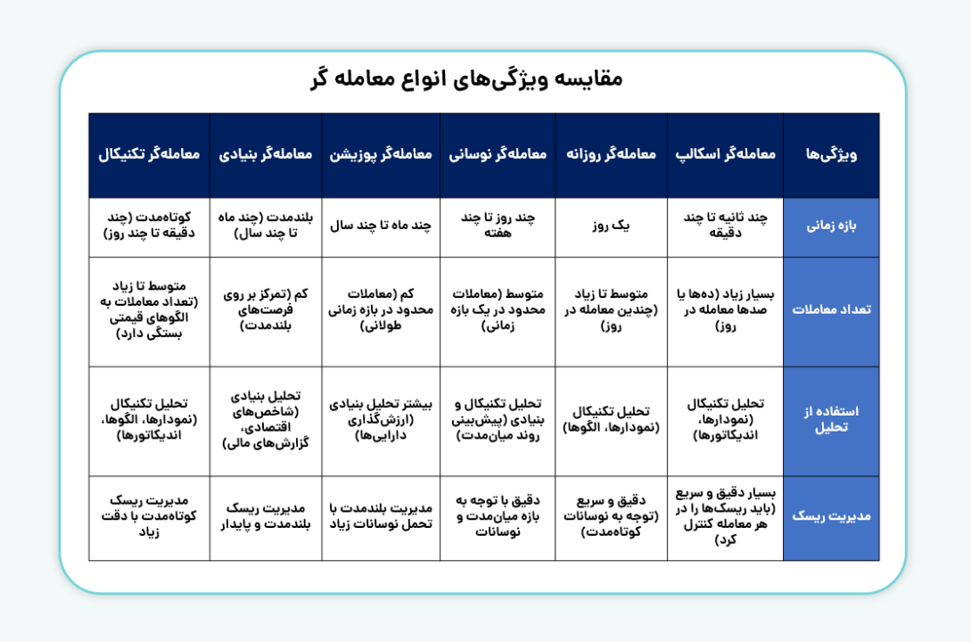 در تصویر زیر به مقایسه ویژگی‌های انواع معامله گران پرداخته‌ایم.