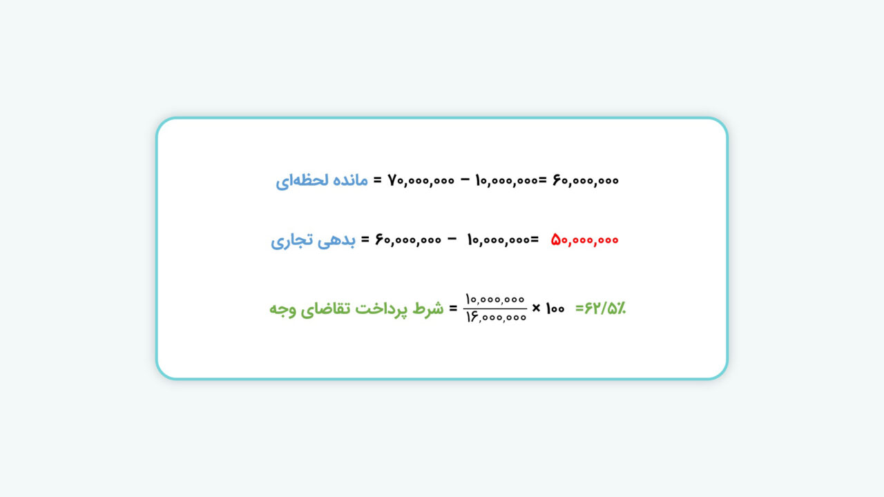 در صورتیکه بدهی تجاری محاسبه شده منفی باشد و نسبت بدهی تجاری به ارزش تضمین مشتری «بیشتر از ۳۰ درصد» باشد، تقاضای وجه قابل انجام نخواهد بود. اما در صورتیکه بدهی تجاری منفی باشد و نسبت بدهی تجاری به ارزش تضمین، «کمتر از ۳۰ درصد باشد»، مبلغ تقاضای وجه قابل پرداخت خواهد بود. به بیان سادهتر اگر بیش از ۳۰ درصد ارزش تضمین شما را بدهی تشکیل دهد، تقاضای وجه قابل پرداخت نیست.
