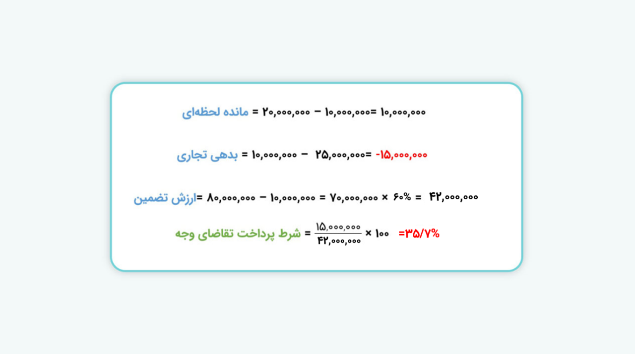 شخصی را در نظر بگیرید که مبلغ ۱۰ میلیون تومان دریافت اعتبار داشته، پرتفویی به ارزش ۸۰ میلیون تومان دارد و در حال حاضر نیز قدرت خرید وی مبلغ «۲۰ میلیون تومان» است. اگر مشتری درخواست تقاضای وجه به میزان «۲۷ میلیون تومان» داشته باشد، محاسبه مانده لحظهای بدهی تجاری و ارزش تضمین او به صورت زیر خواهد بود:
