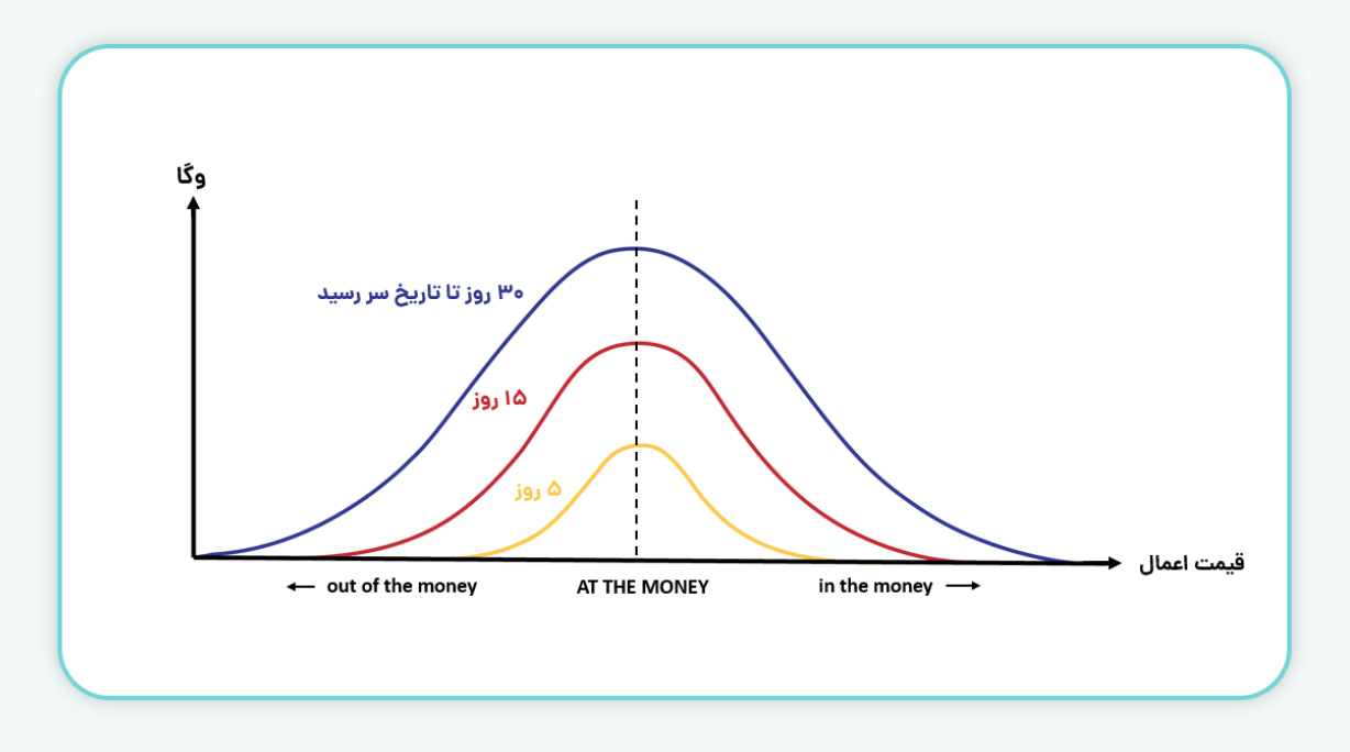 در هر سه منحنی (۵، ۱۵ و ۳۰ روز)، بیشترین مقدار وگا دقیقاً در نقطهای اتفاق میافتد که قیمت دارایی پایه برابر با قیمت اعمال است. منحنی بنفش (۳۰ روز تا تاریخ سررسید) بالاترین مقدار وگا را نشان میدهد و منحنی زرد (۵ روز تا تاریخ سررسید) کمترین مقدار Vega را دارد.