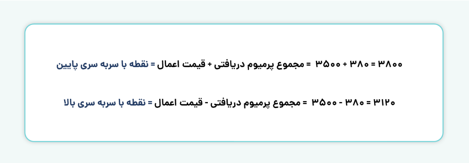محدوده سربهسری از قیمت اعمال (۳,۵۰۰ تومان) به اضافه یا منهای مجموع پرمیومها (به ازای هر سهم) محاسبه میشود.