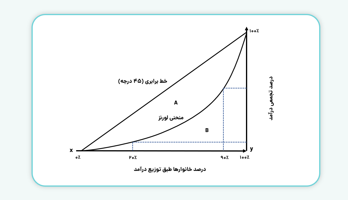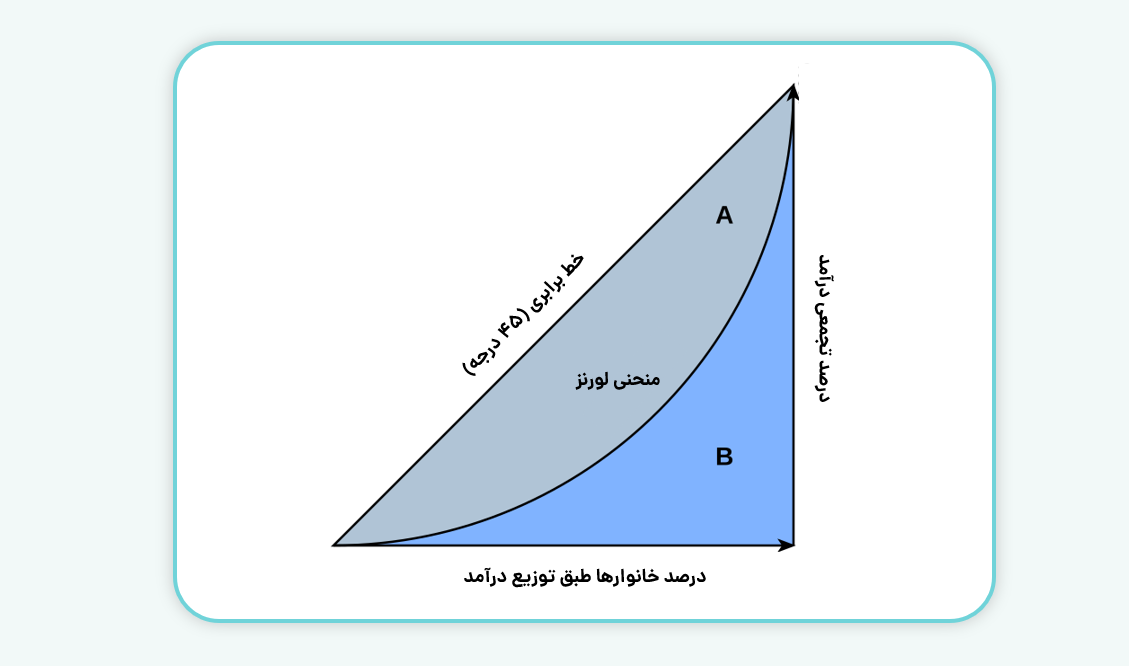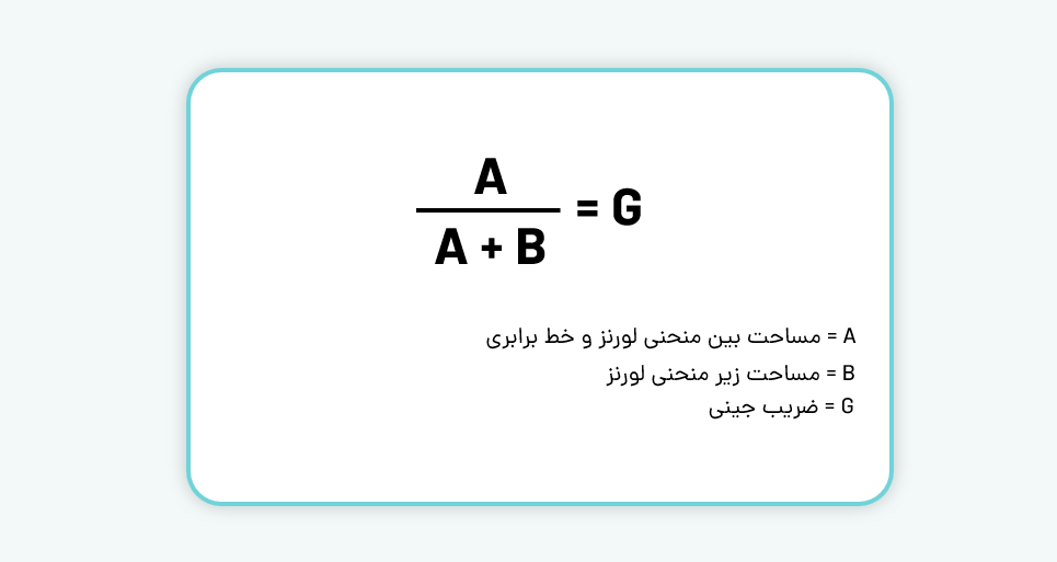 ضریب Gini که از این معادله به دست میآید، عددی بین صفر و یک خواهد بود. هرچه A بزرگتر باشد، ضریب جینی افزایش یافته و نابرابری بیشتری در توزیع درآمد یا ثروت در جامعه وجود خواهد داشت.