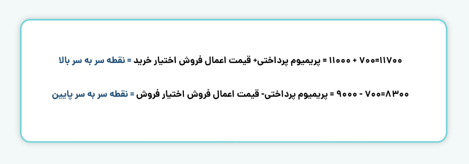 نقطه سر به سر بالا = ۱۱٬۷۰۰ ریال - نقطه سر به سر پایین: قیمت دارایی پایه باید کمتر از ۹۰۰۰ ریال – ۷۰۰ ریال باشد.