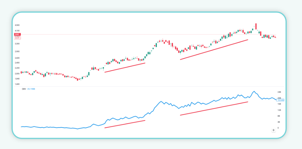 - اگر OBV در حال افزایش باشد و قیمت نیز افزایش یابد، نشاندهنده روند صعودی قوی است.