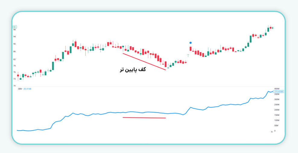 زمانی که قیمت یک دارایی کف جدیدی پایینتر از کف قبلی خود ثبت کند (کاهش قیمت)، اما اندیکاتور حجم متوازن همزمان کف بالاتر یا برابر نسبت به کف قبلی خود نشان دهد، این وضعیت نشاندهنده واگرایی مثبت یا صعودی است. در این حالت، افزایش OBV با وجود کاهش قیمت، نشاندهنده افزایش حجم معاملات و احتمال تغییر روند نزولی به صعودی است.