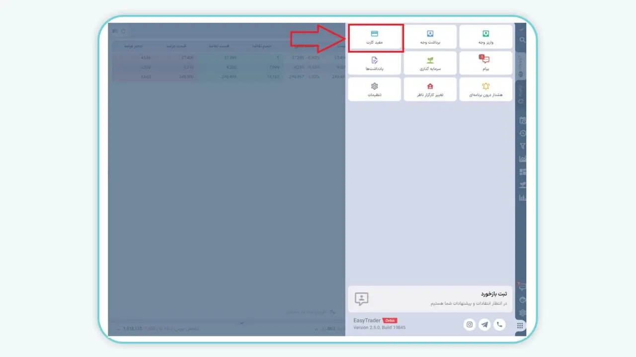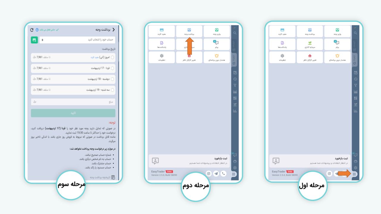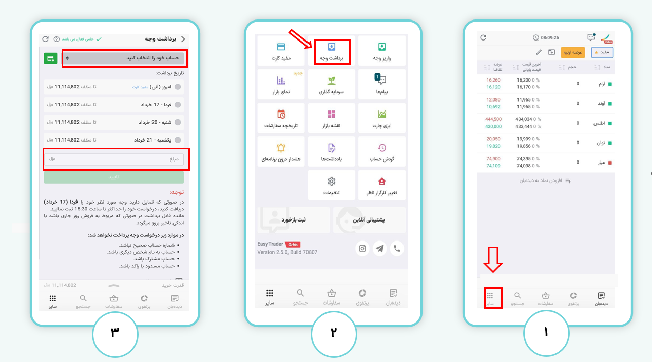در صورتی که مانده وجه از قبل دارید یا دارنده طرح حامی هستید و برای اولین روز کاری پیش رو قصد برداشت وجه دارید، از طریق سامانه معاملاتی ایزی تریدر (نسخه موبایل و دسکتاپ) میتوانید مطابق با راهنمای زیر عمل کنید: