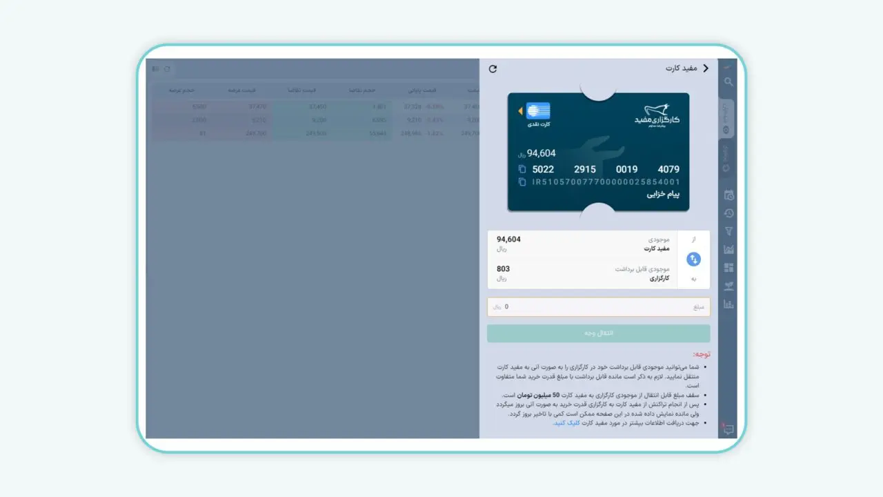 نکته: سقف مبلغ قابل انتقال از موجودی کارگزاری به مفید کارت، ۲۰۰ میلیون تومان در روز است.